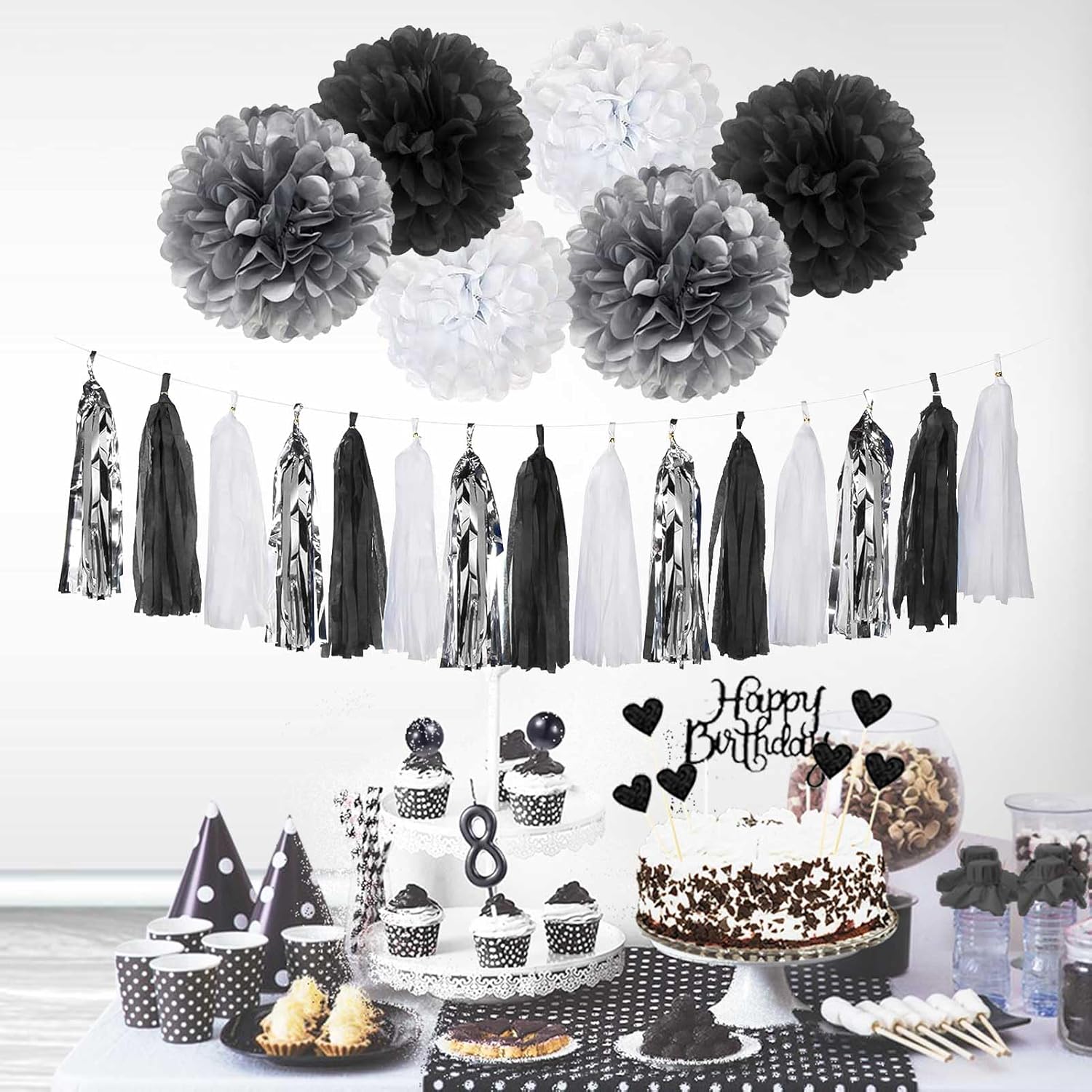 Birthday Decorations for Men, Black and Silver Happy Birthday Party Decorations, Black and White Party Supplies – Banner, Balloons, Tissue Pompoms, Swirls, Tassels Garland