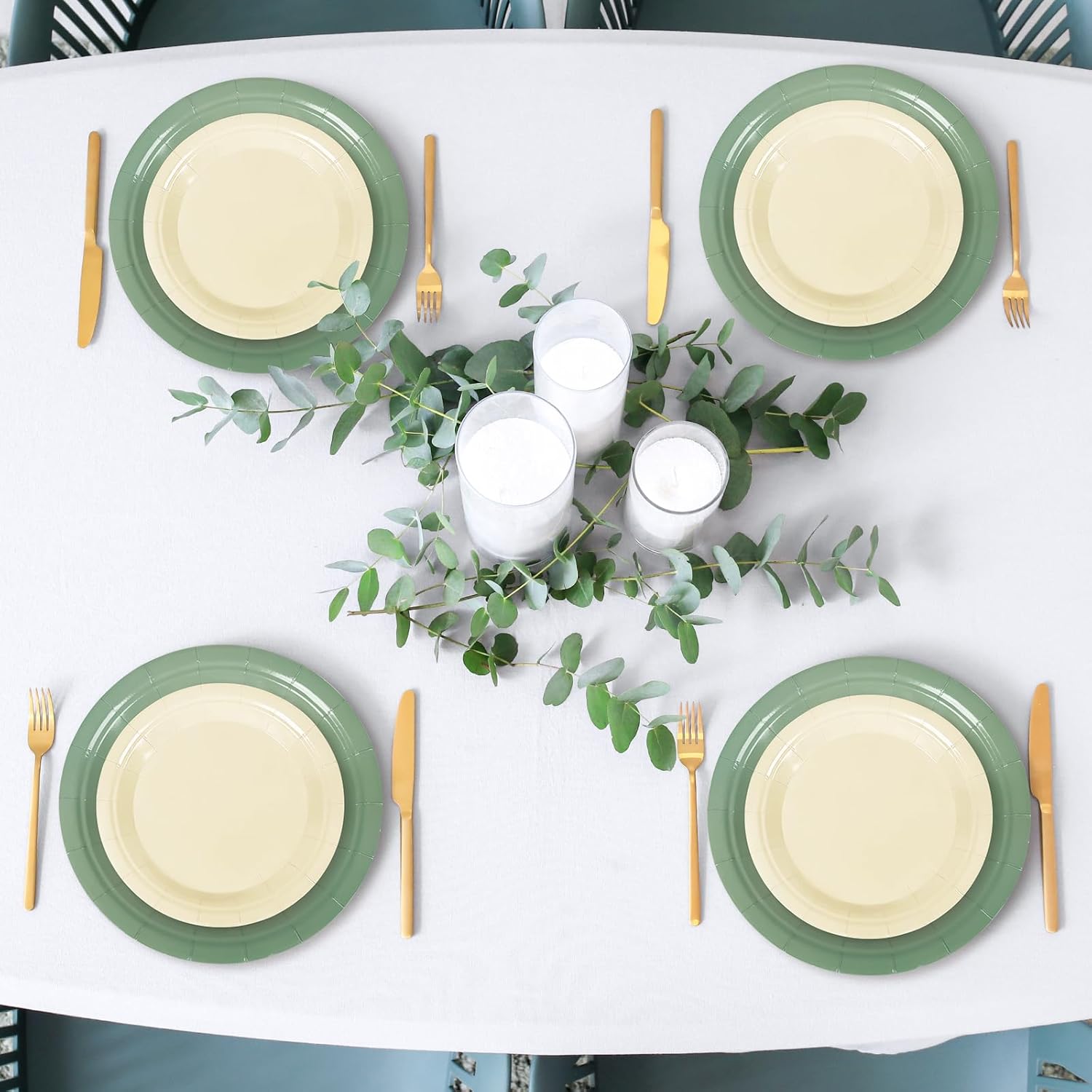 Whaline 100Pcs Ivory Sage Green Tableware Set Wedding Disposable Dinnerware 50Pcs Paper Plates 25Pcs Napkin 25Pcs Cups For Birthday Party Supplies Table Decor