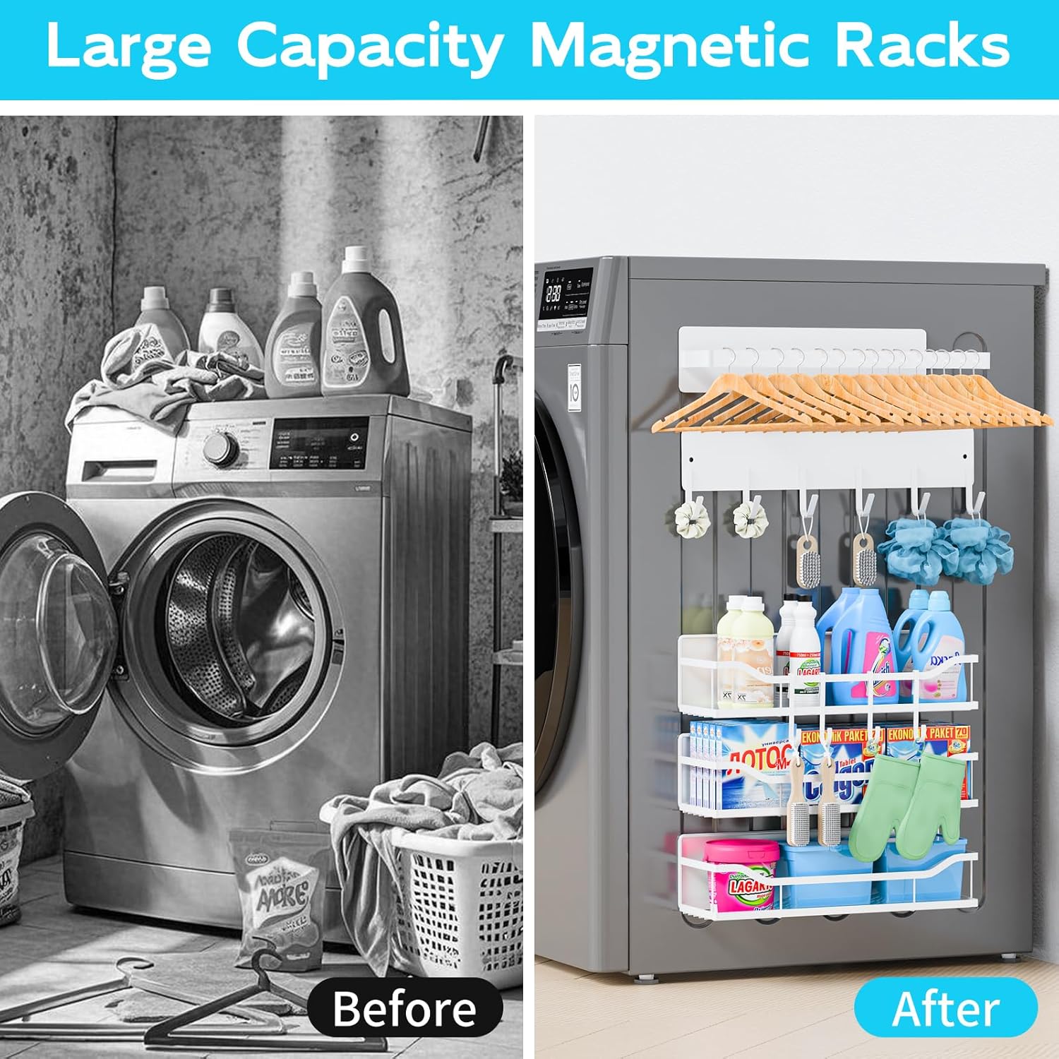 Maximize Your Space Effortlessly: Our 5 pack magnetic shelves offers a clever, space-saving solution perfect for your laundry room. Simply attach these magnetic racks to your washing machine and transform that unused space into a functional storage center for all your laundry essentials. From detergents to daily accessories, everything stays neatly organized, bringing more harmony to your home life