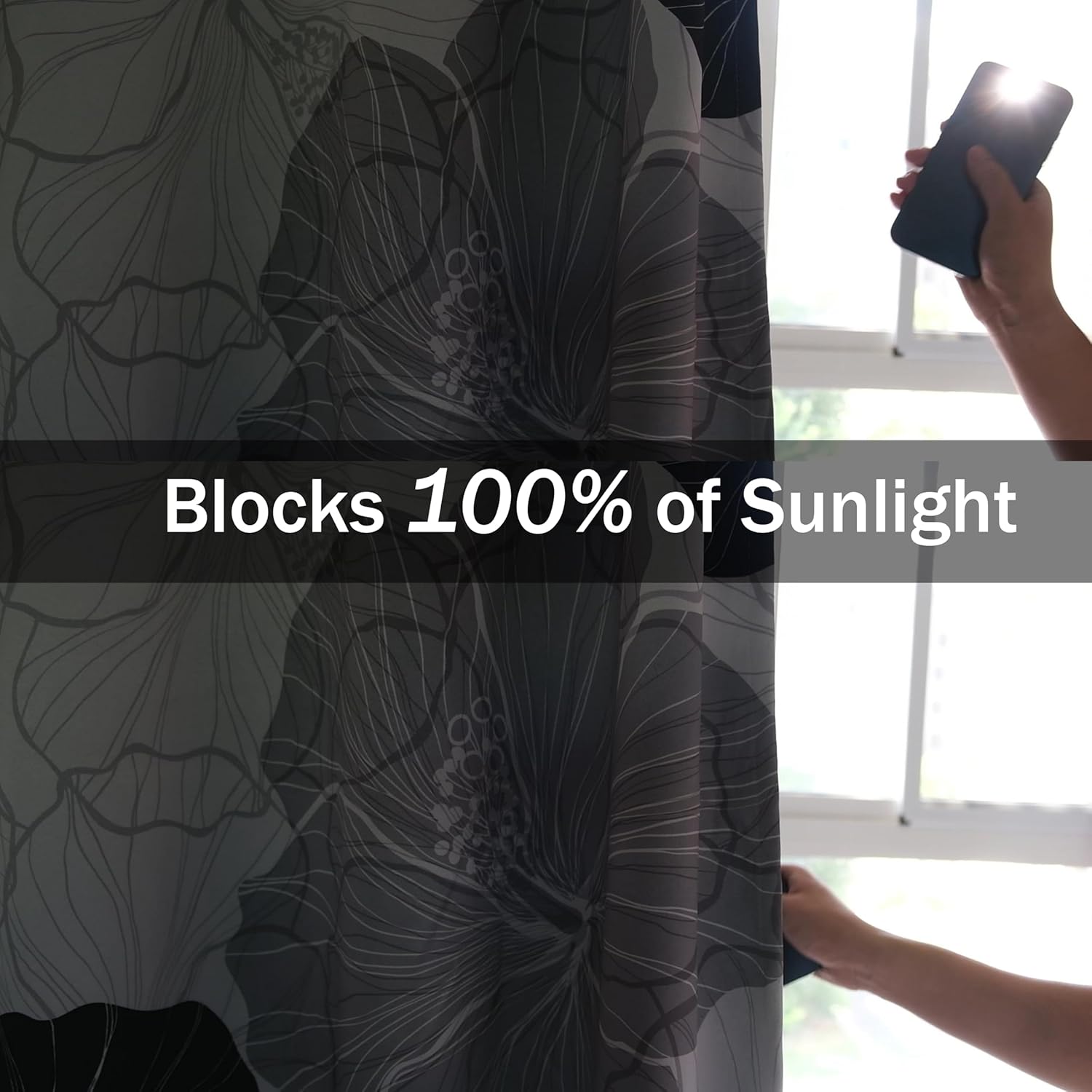 100% Blackout Curtains 2 Panels Set Black White Grey Floral Black Out Curtain Gray Flower Chic Thermal Insulated Window Treatments Decor for Living Room Bedroom Darkening Curtain 52×96 Inch