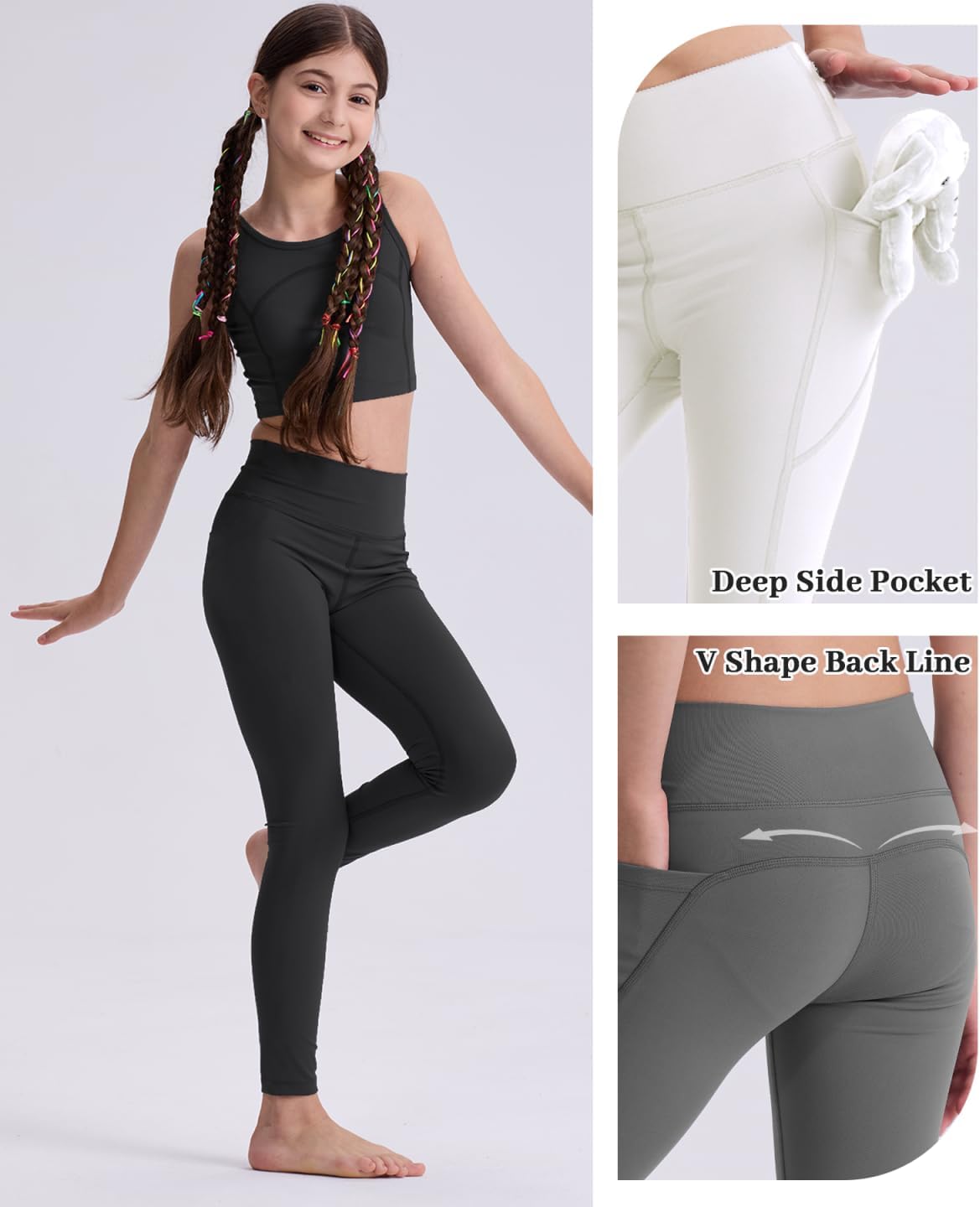 3 Pack Girls’ Leggings with Pockets, Ankle Length Athletic Yoga Pants for Kids Clothes