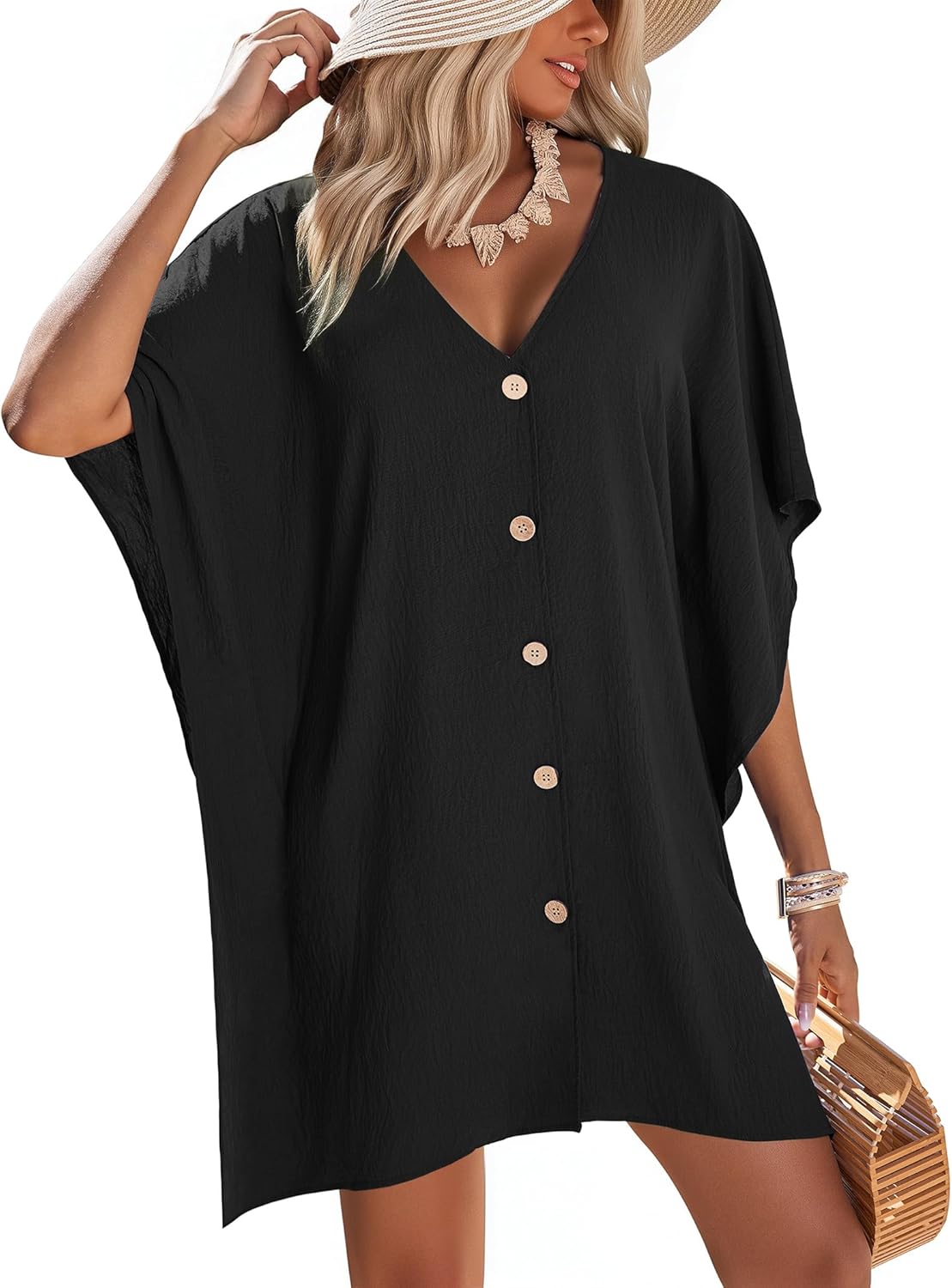 AI’MAGE Womens Swimsuit Cover Up Button Down Bathing Suit Coverups 3/4 Sleeve Beachwear Oversized Bikini Shirt Dresses S-XXL