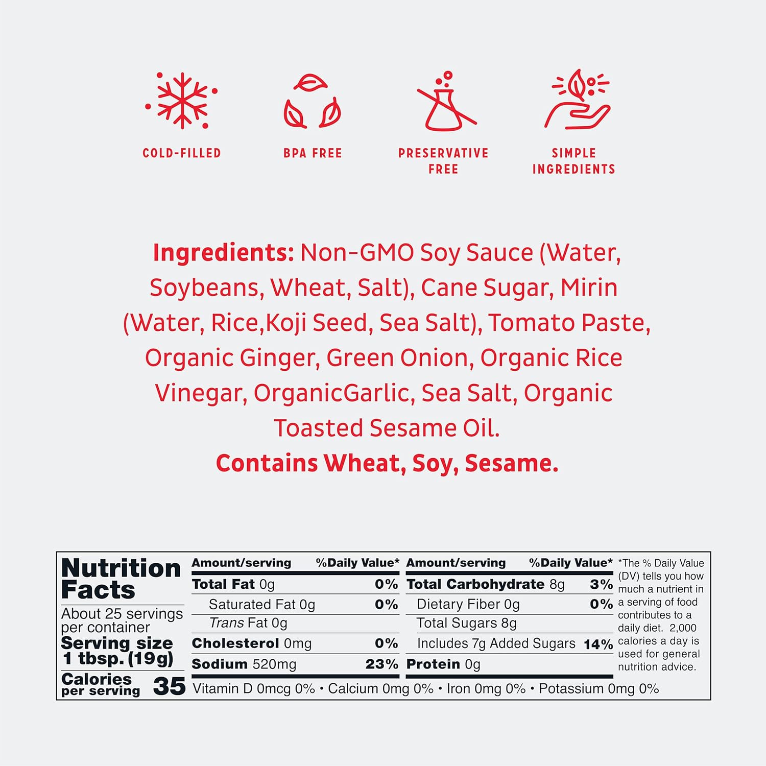 ❤️ OUR INGREDIENTS MATTER: Non-GMO Soy Sauce (Water, Soybeans, Wheat, Salt), Cane Sugar, Mirin (Water, Rice, Koji Seed, Sea Salt), Tomato Paste, Organic Ginger, Green Onion, Organic Rice Vinegar, Organic Garlic, Sea Salt, Organic Toasted Sesame Oil. Contains Wheat, Soy.