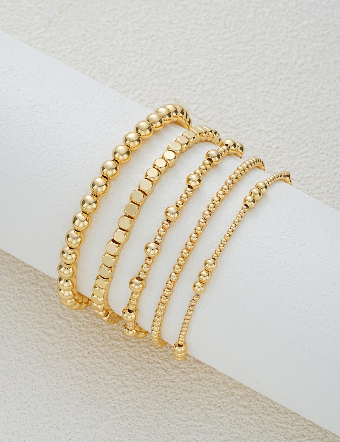Dodder Gold Beaded Bracelets Set for Women, 14K Gold Plated Elastic Stretch Bead Bracelet Stack 5 Pcs 6″-7.5″