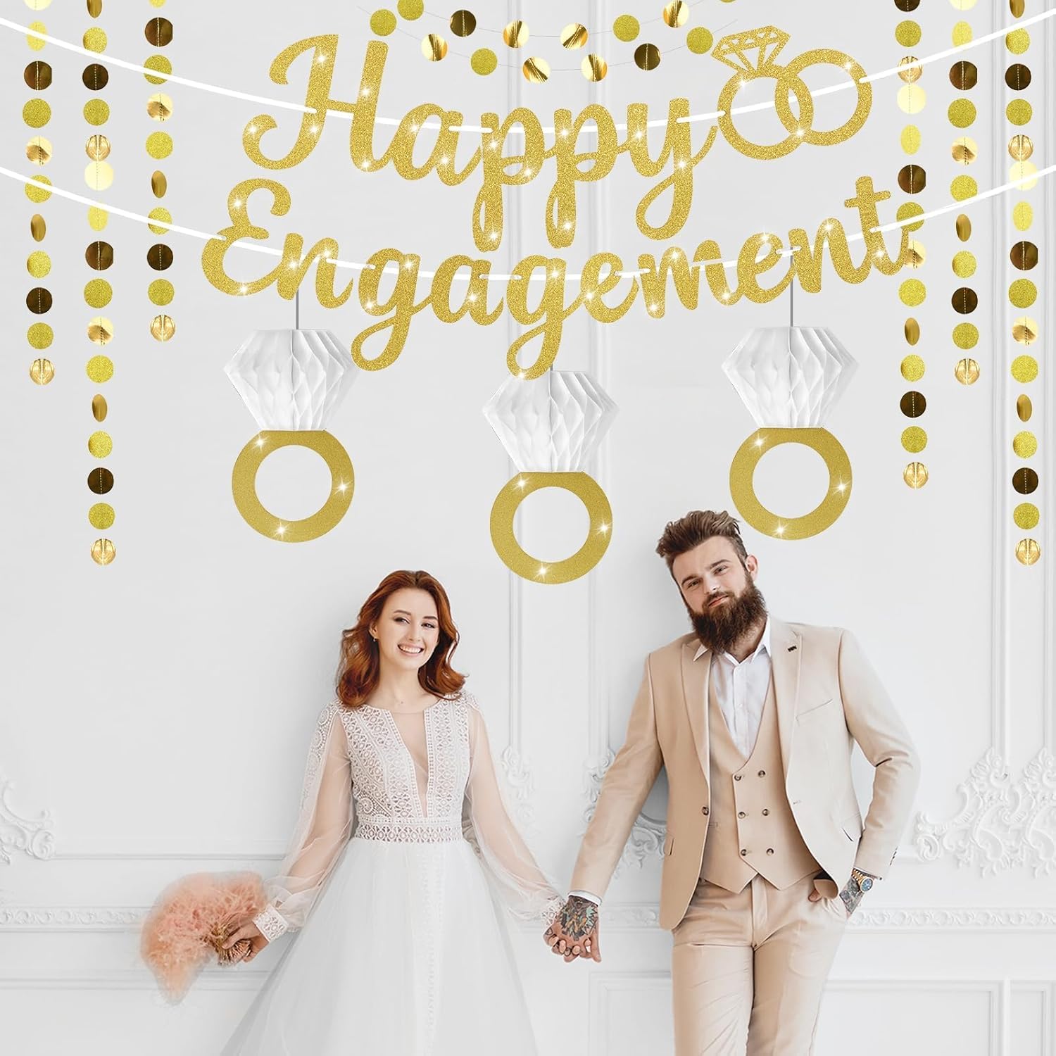 Package includes: Engagement party decoration sets include 2 gold glitter circle dot garlands(13.4ft/4m), 1 happy engagement banner, 3pcs of diamond ring hanging honeycomb decor. With rich patterns and ample quantities, this set helps create the great atmosphere for a memorable engagement celebration.