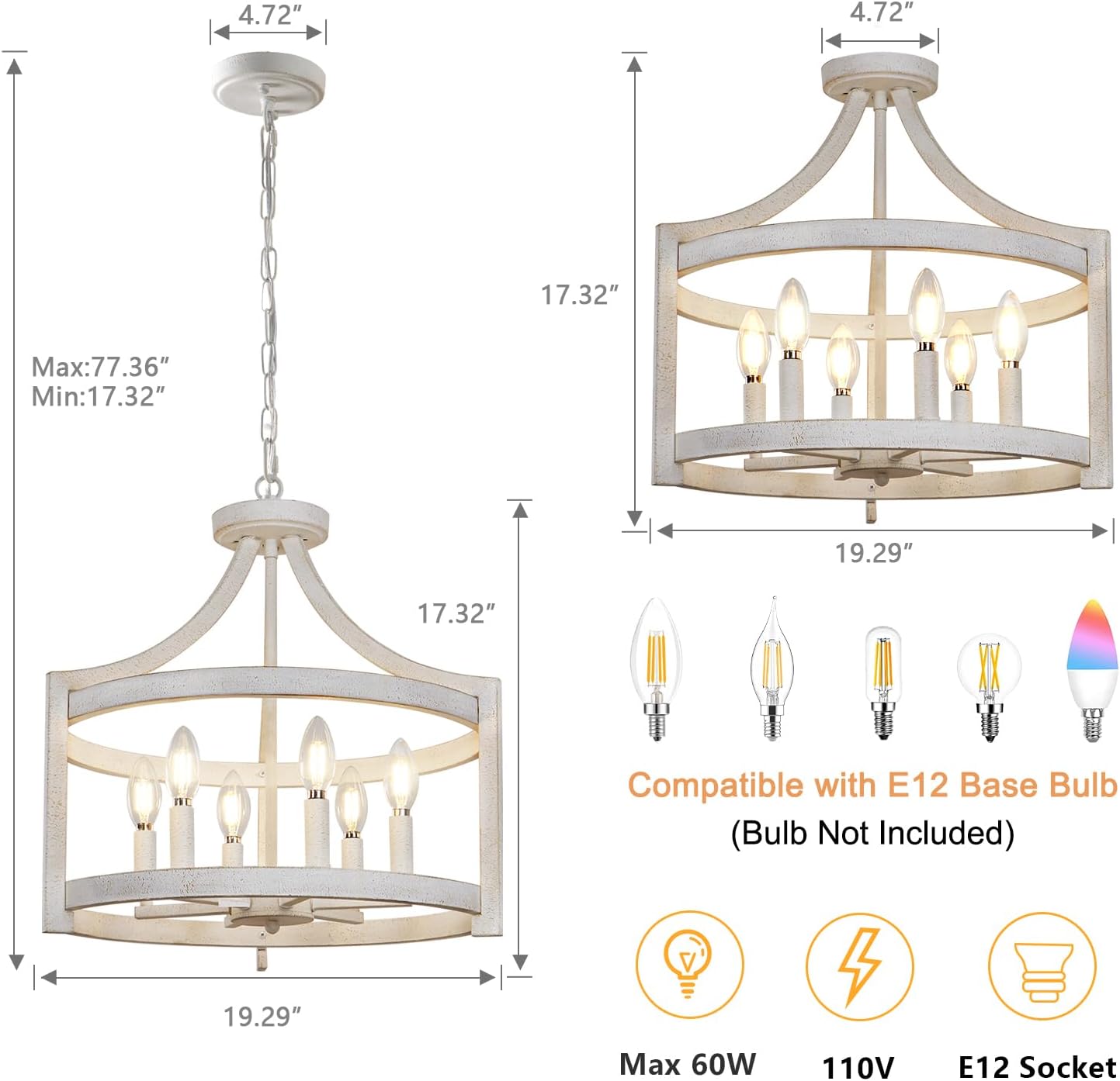Farmhouse Chandelier, 6-Light Vintage White Chandeliers for Dining Room, Convertible Semi Flush Mount Ceiling Light, Metal Hanging Pendant Lighting Fixture for Kitchen Entryway Foyer Hallway
