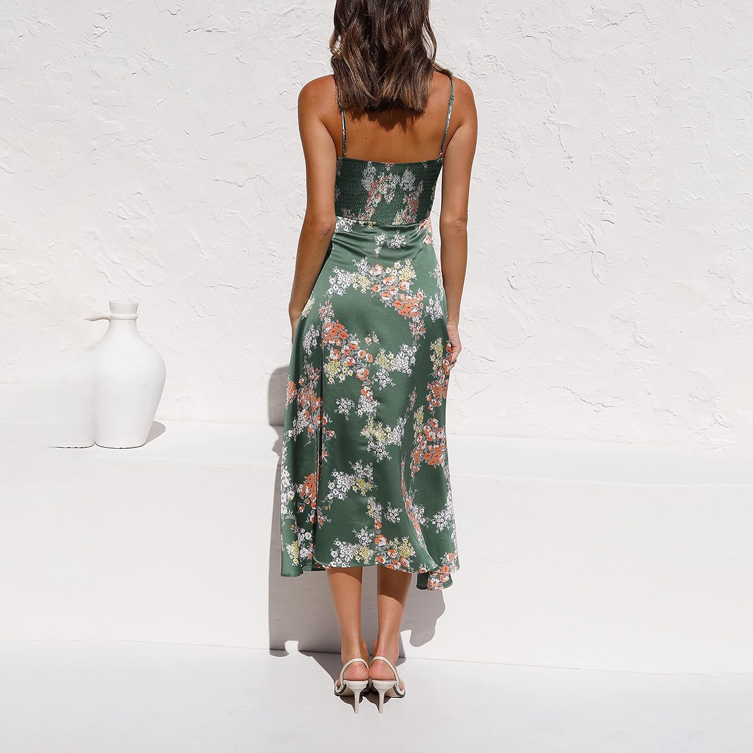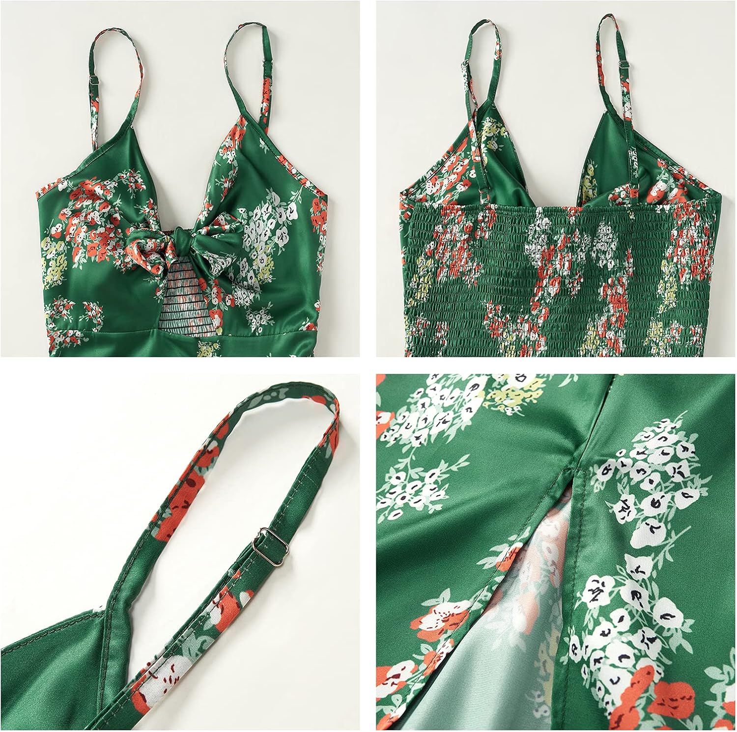 Fashionme Women Spaghetti Strap Midi Satin Dresses Tie Front Backless Split Hollow Dress