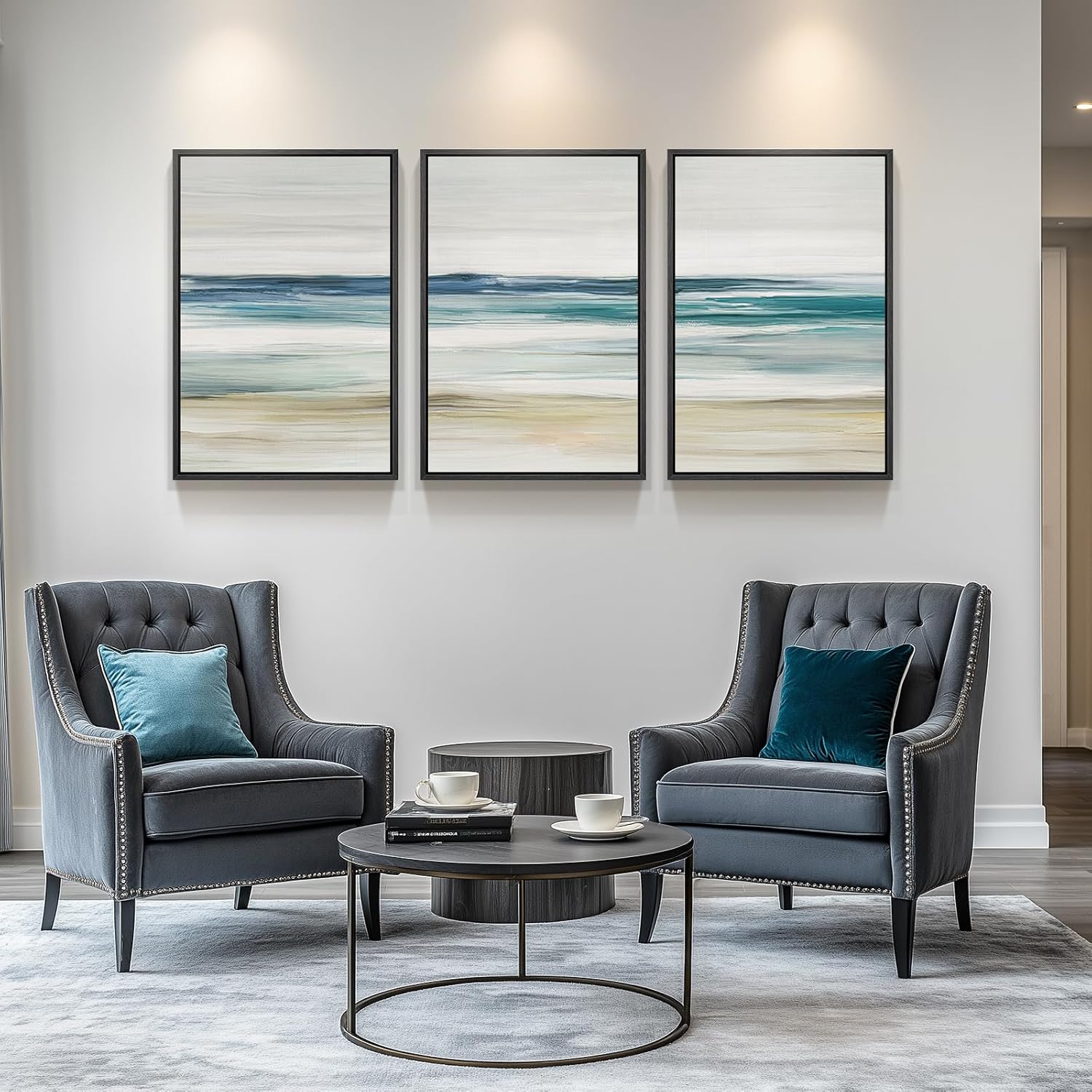 Framed Abstract Coastal Wall Art: This is a set of 3 framed beach abstract wall paintings designed in an abstract landscape style. Measuring 24×36 inches each, these large art pieces on canvas feature peaceful ocean landscapes and are perfect for decorating a room to add more peace and artistry to your room