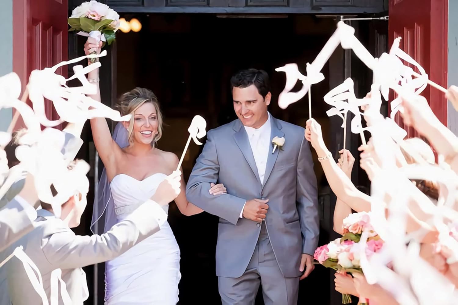 White ribbon lace stick wands will definitely add charm to your wedding. Flowing pieces satin ribbon and lace (24″) securely attached to a 12″dowel and accented with a silver bell. Well crafted wish wands with smooth stick, durable and comfortable to take with hands.