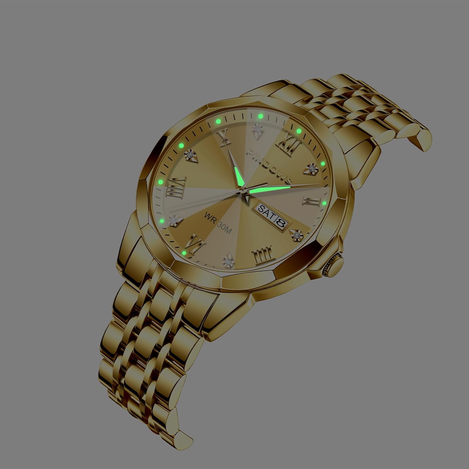 PINDOWS Watches for Men Diamond Date Calendar Quartz Watches Analog Stainless Steel Waterproof Luminous Two Tone Business Watch