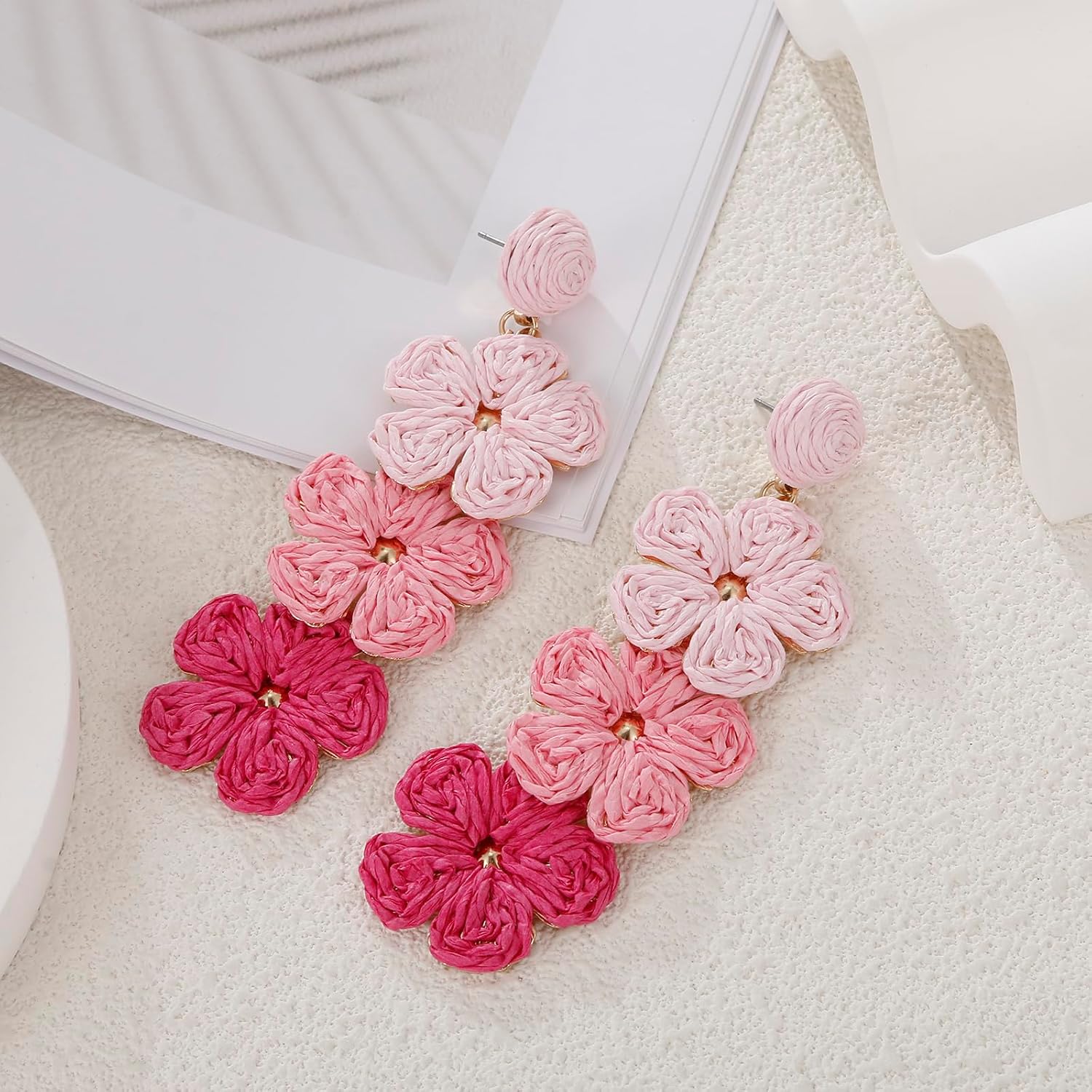 Raffia Flower Earrings, Raffia Straw Wrapped Flower Drop Dangle Earrings Summer Tropical Beach Jewelry