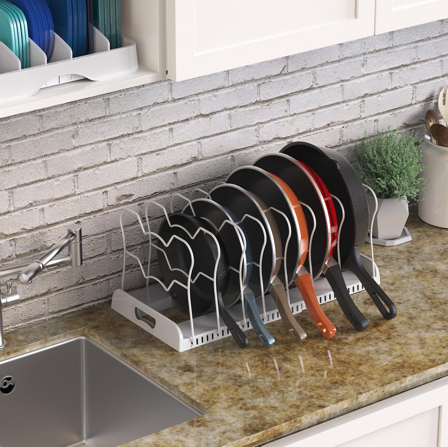 Expandable Design: Adjustable rack extends to fit up to 10 compartments, ideal for pots, pans, lids, bakeware, cutting boards, and more.