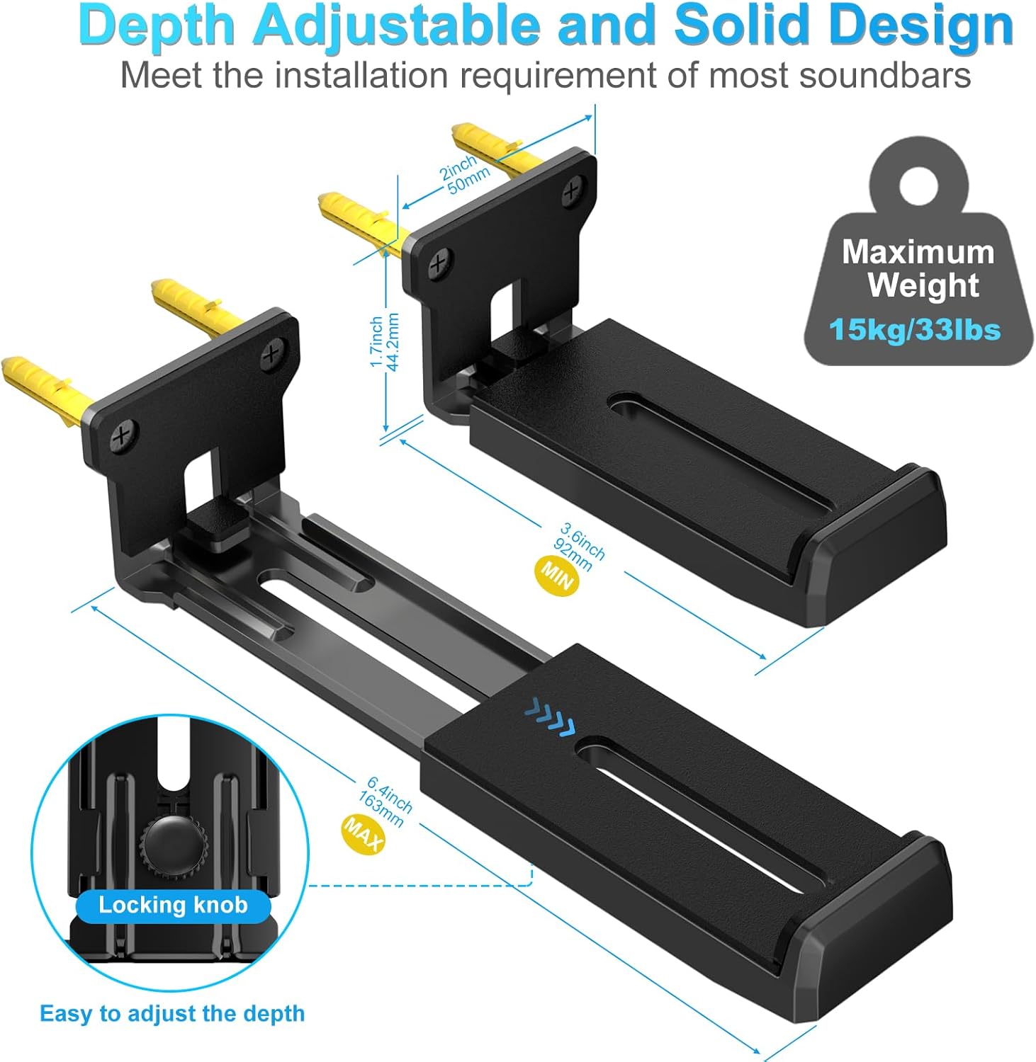 ADJUSTABLE DEPTH : The soundbar mounting bracket under TV can be adjusted the depth from 3.6” to 6.4” for Dolby Atmos soundbars , You can easily adjust the depth through the locking knob under the sound bar shelf according to the thickness of the soundbar.