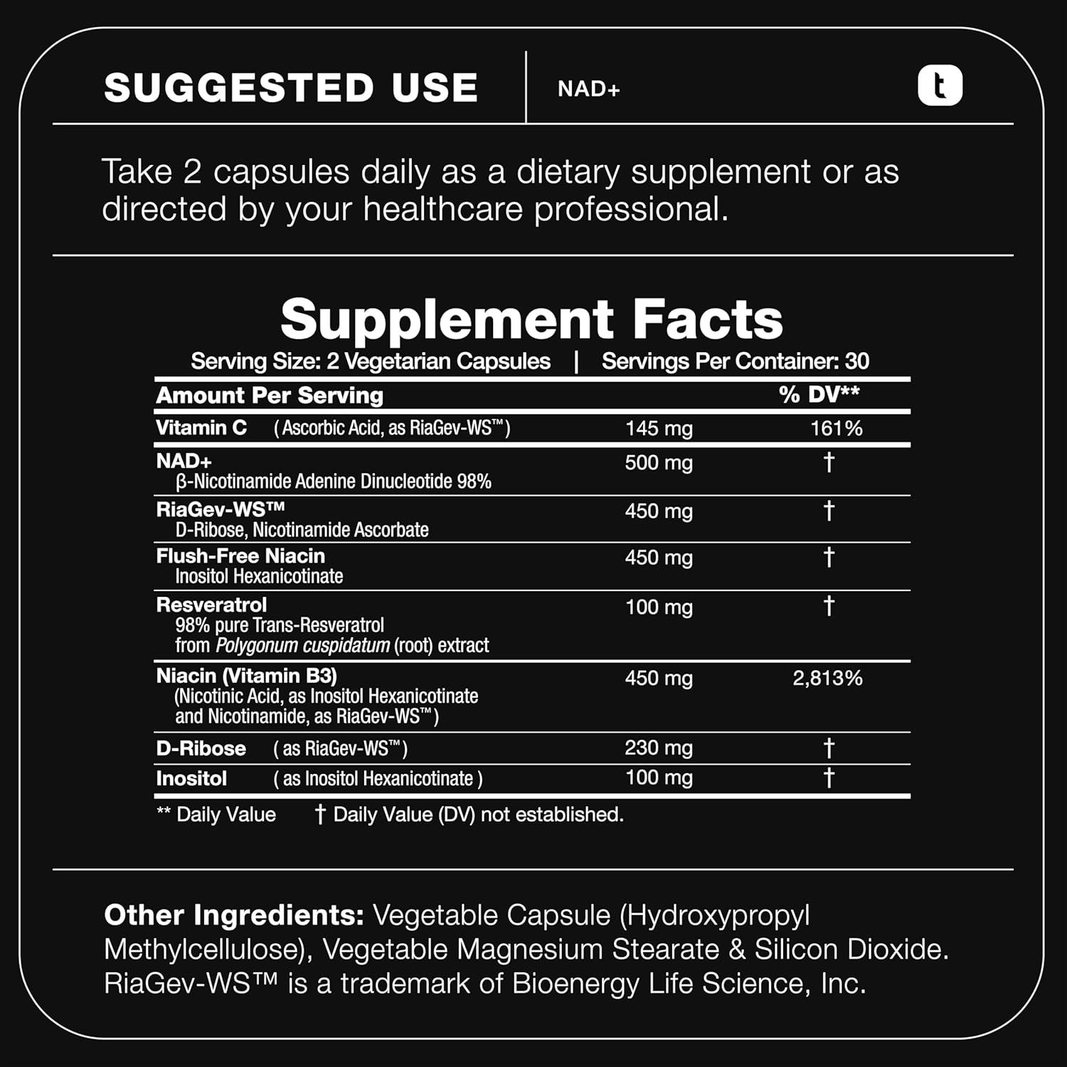 Toniiq NAD+ Supplement 1500mg – Ultra High Strength NAD Supplement with Clinically Studied Ingredients with Patented RiaGev-WS™, Resveratrol, and Niacin – 60 Capsules