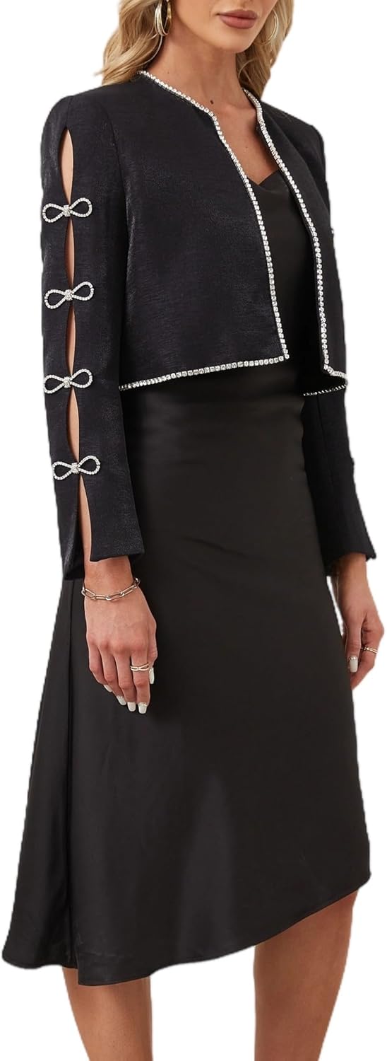 This cropped cut jacket feaures crystals trimmed round neck and open front design, hollow out sleeves adorned with butterfly shaped crystals, wear yours to make an sophisticated and sweet statment.