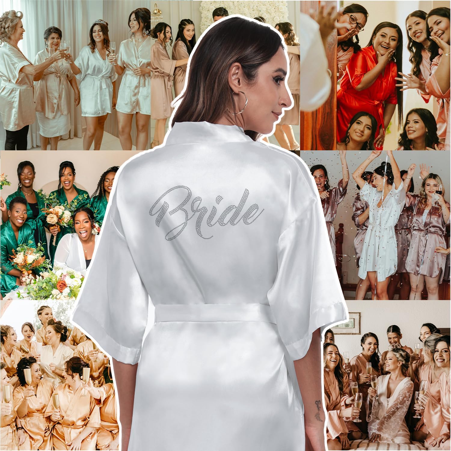 Women’s Satin Robe Bride Bridesmaid Short Kimono Robes with Silver Rhinestones for Wedding Party Getting Ready